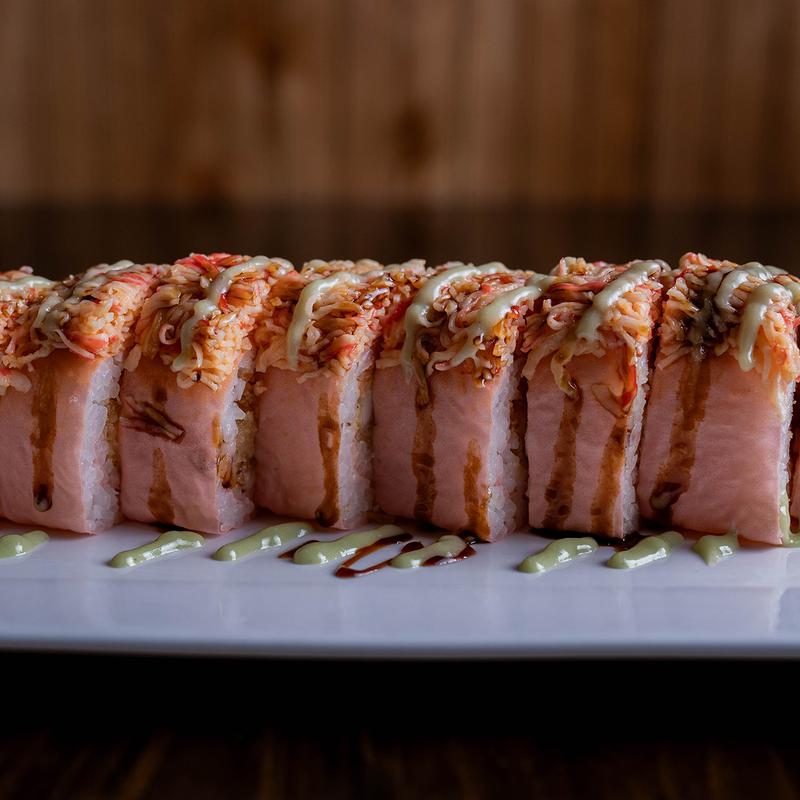 Crabmeat, avocado wrapped with cucumber with ponzu sauce.